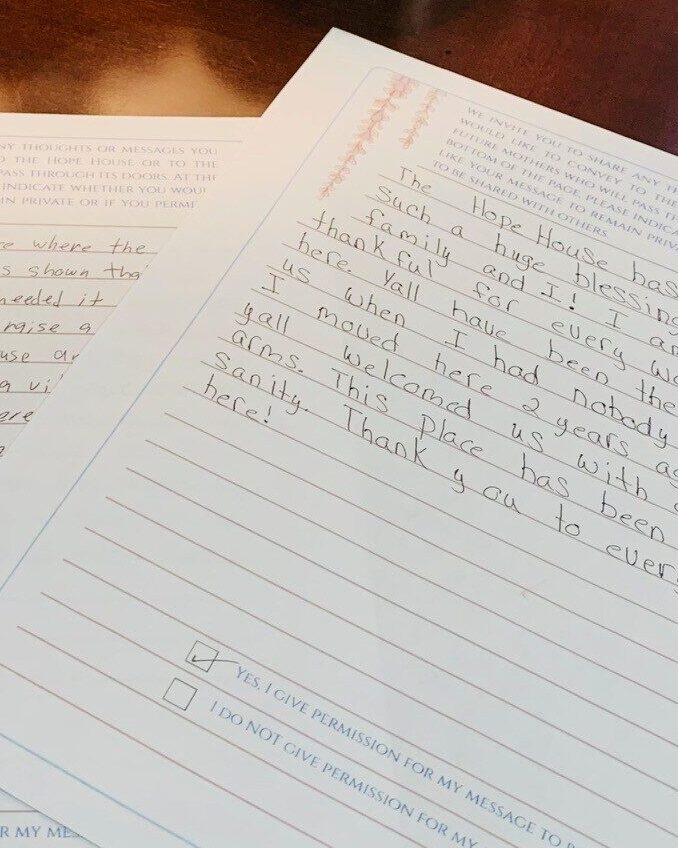 “The Hope House has been such a huge blessing for my family and I! I am very thankful for every woman here. Y’all have been there for us when I had nobody here. I moved here 2 years ago, and y’all welcomed us with open arms. This place has been my sanity. Thank you to everyone here!”